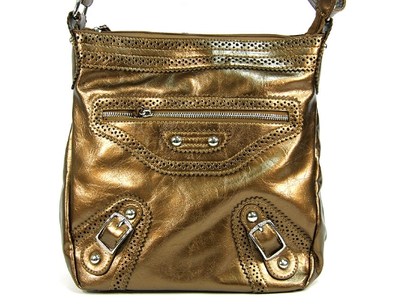 Messenger Bag made of Polyurethane material has top zipper closure with adjustable straps & also has a front zipper pocket. Accentuated with belt buckle straps and diamond studs.