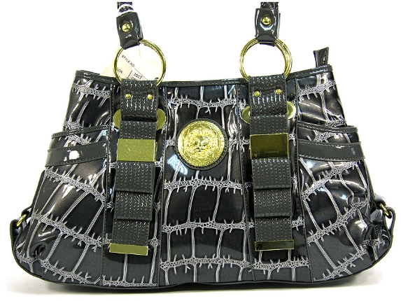 Fashion Handbag in Metallic PVC material with belted accents in the front as well as open pockets on the sides. Double shoulder handle with top zipper closure also.