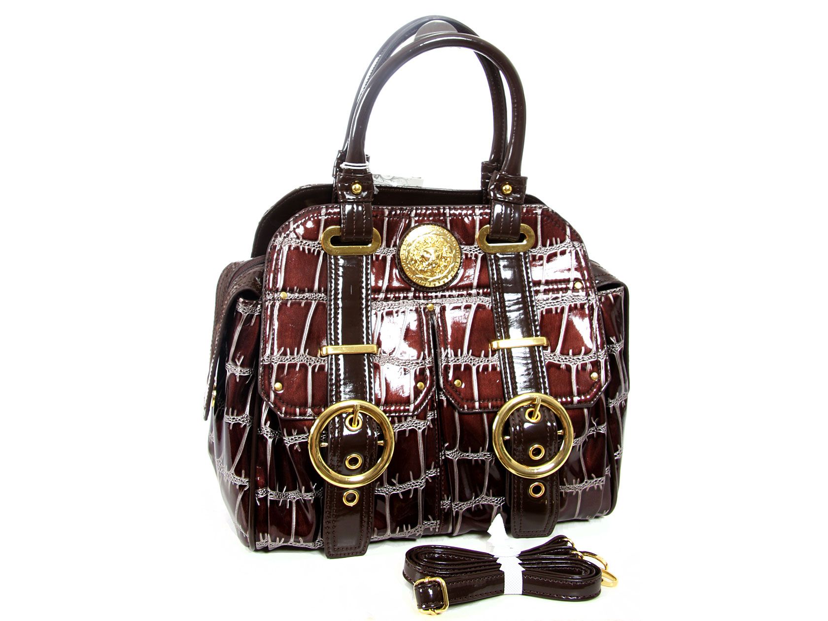 Double strapped PVC Fashion Handbag made with multiple extra outer compartments and buckles. Magnetic closure on top.
