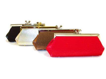 Metal frame satin evening bag. It has kiss lock closure and has shoulder chain.