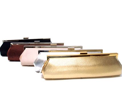 Metal frame solid color satin evening bag. It has shoulder chain.