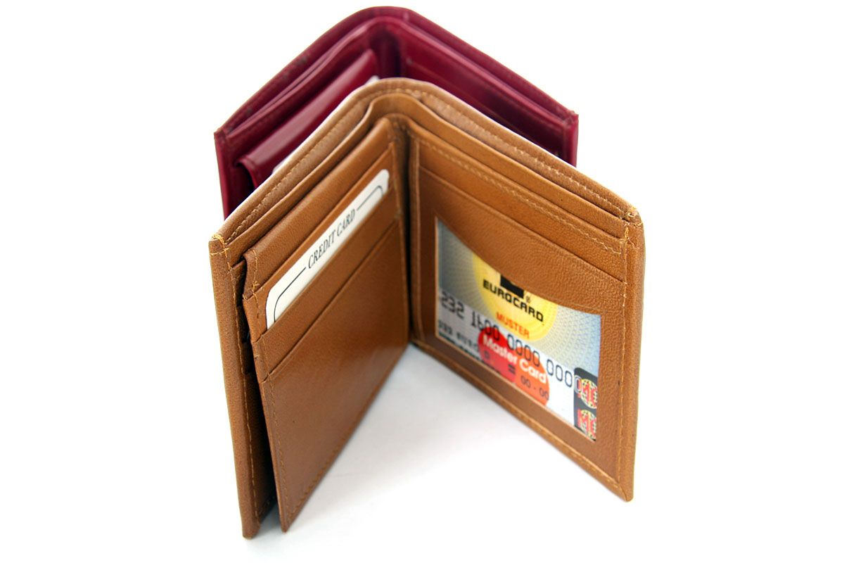 Carry your money in style. This is a genuine leather wallet with 6 credit card slots, 2 ID windows. The left flap lifts up to reveal one ID window. As this is genuine leather, please be aware that there will be some small creases and nicks in the leather but the wallet are all brand new.
