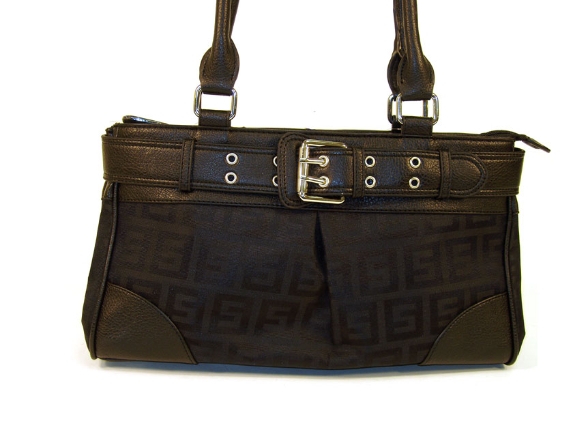 Patterned Jacquard Handbag with Belt like trim. Top zipper closure and double shoulder handle. Imported.