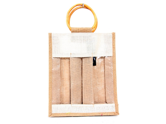 3 Wine Bottle Jute Bag with wooden handle.