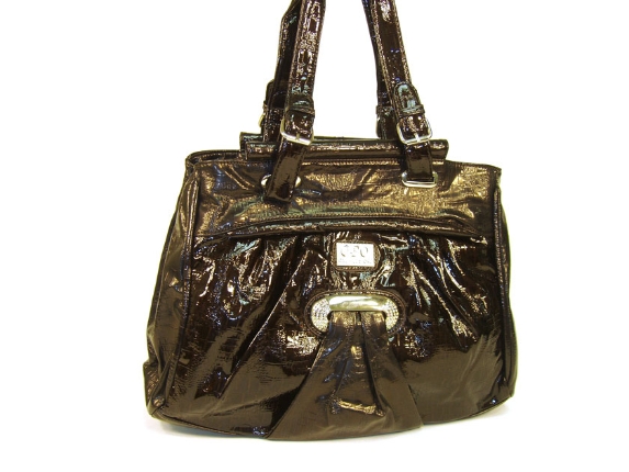 Fashion Handbag made of polyurethane material. This is a double strap bag with belt buckle like straps and a top zipper closure.