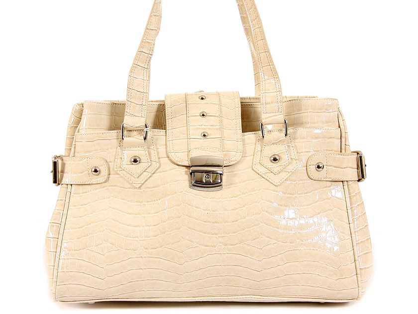 Crocodile Embossed PVC Fashion Handbag with double shoulder straps, belt accents on the sides, push lock closure over the top zipper closure of the bag.