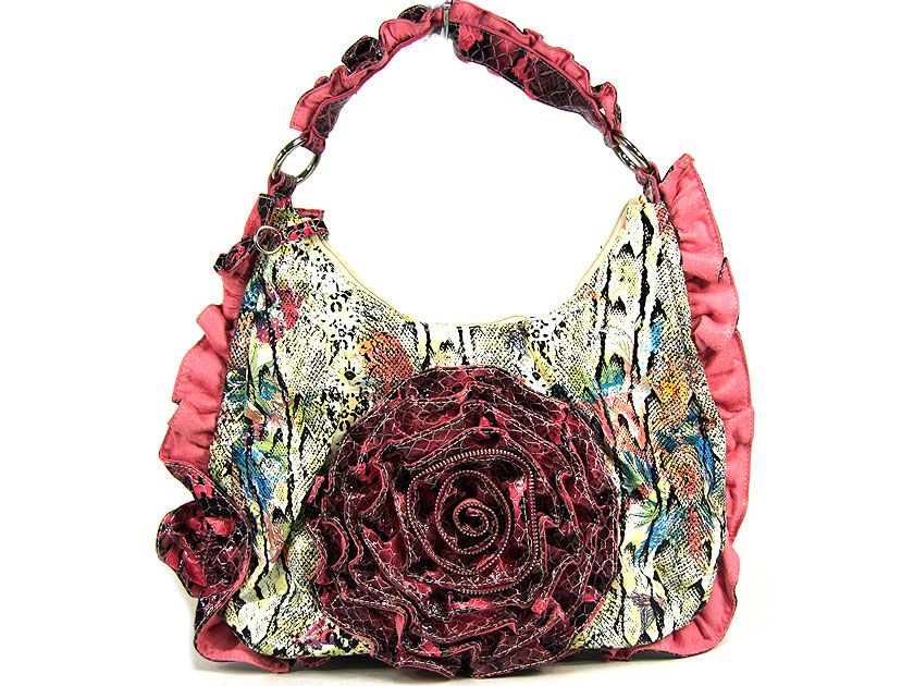 Trendy Snake Print in Multi Colors PVC Hobo Handbag with big floral applique, has a single strap and a zipper closure. Gathered trim borders the handle and the sides of the bag.