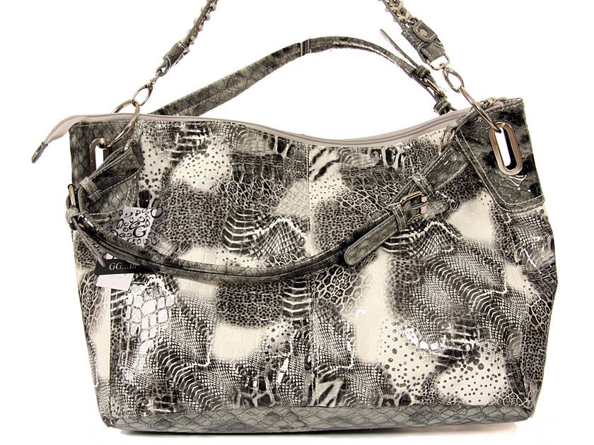 PVC Fashion Handbag has an animal print multi patch pattern, a top zipper closure, a double handle and a detachable shoulder strap.