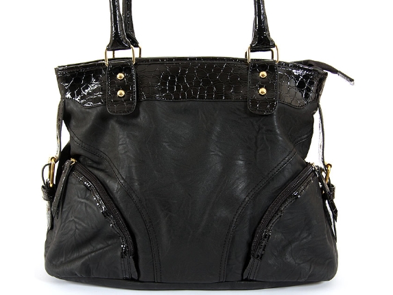 Two Tone tote bag has a double handle, a top zipper closure, outside pockets and crocodile trimming. Made of faux leather.