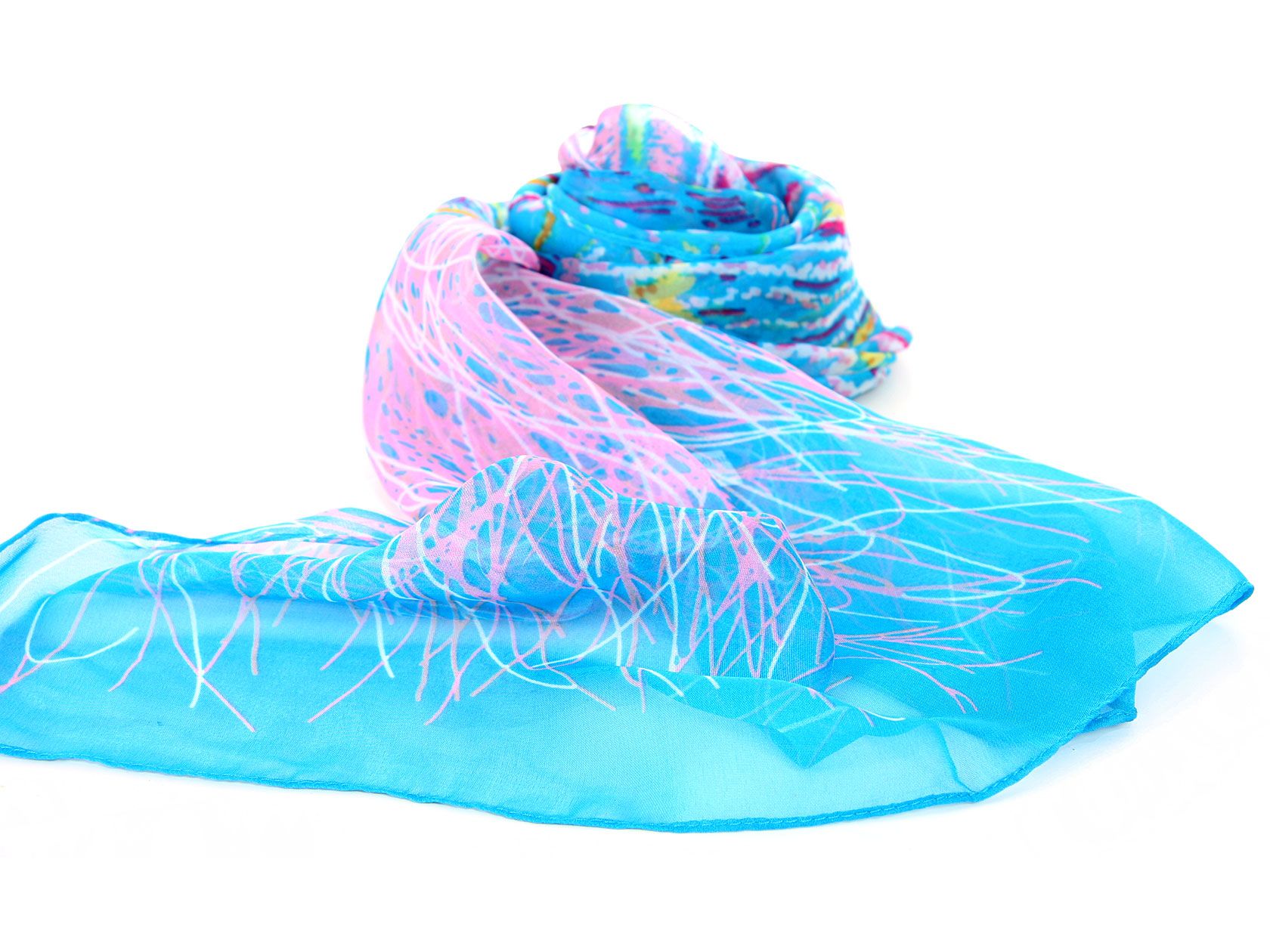 Artistic turquoise colored sheer & lightweight scarf with pink colored print on it. 60% Polyester and 40% Silk. Hand wash.