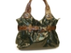 PVC fashion Handbag has a glossy texture, a double handle, a top zipper closure and a belt detail with a lobster claw closure.