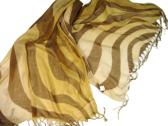 Lightweight Shaded Polyester scarf in shades of gold with brown waves over it. Fringes on its ends. Imported.