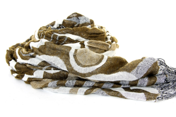 This artistically patterned 100% Polyester scarf in shades of olive is quilted and super soft to use. This retro scarf can be teamed with any kind of outfit. Thin fringes on the edges adds that extra zing to it. Imported.