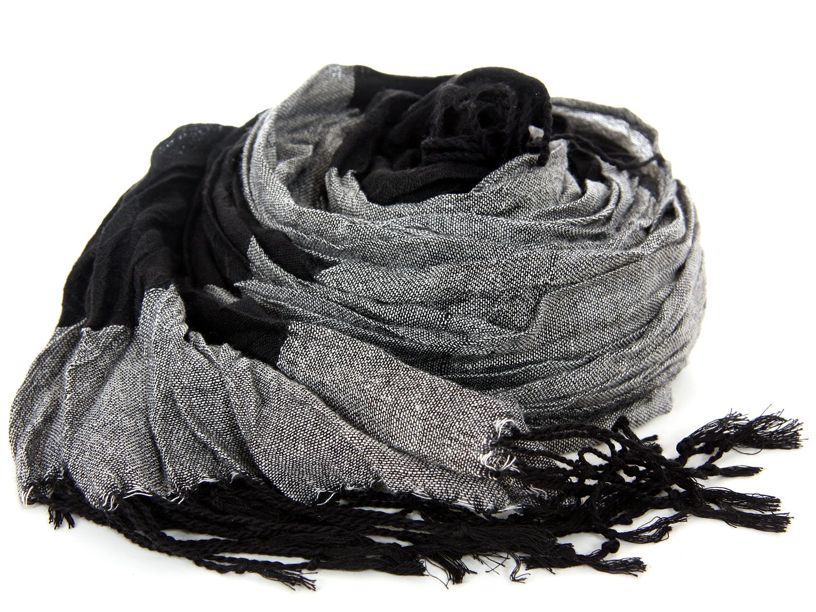 Crinkled Polyester Scarf with Alternating Coffee & Gray colors horizontally. Small diamond pattern all over it. Twisted long fringes in black on its ends. Can be teamed up with a formal or casual attire. Imported. Hand wash.
