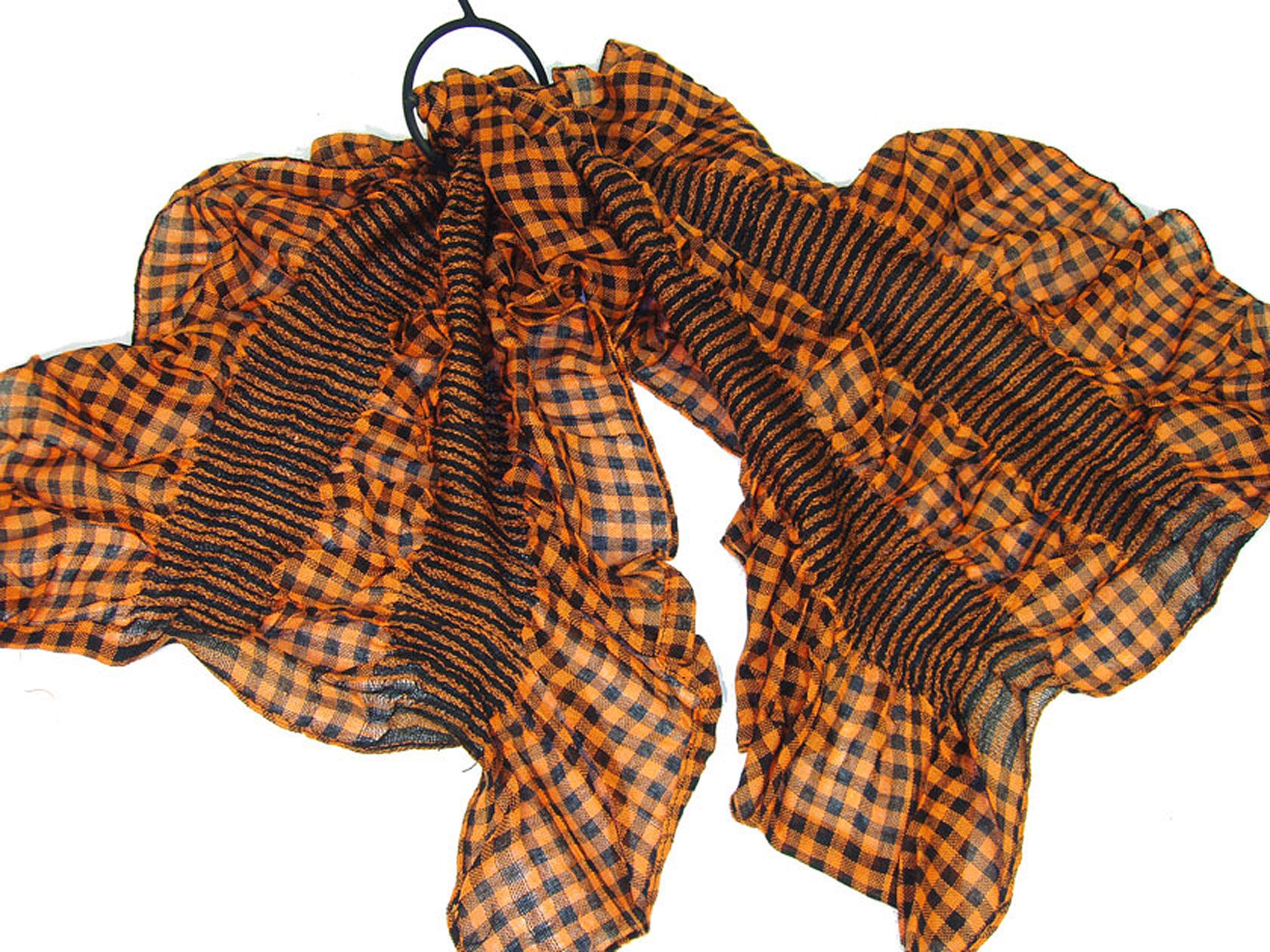 This checkered print orange & black 100% polyester scarf can be a perfect accessory all year round. The scarf is stretched in the middle with a striped pattern & gives a ruffled look. Imported.