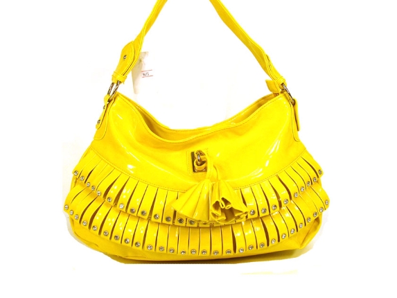 Fashion shoulder bag has a top zipper closure, a single strap and layered frill in same fabric with studded details on it. Made of PVC.