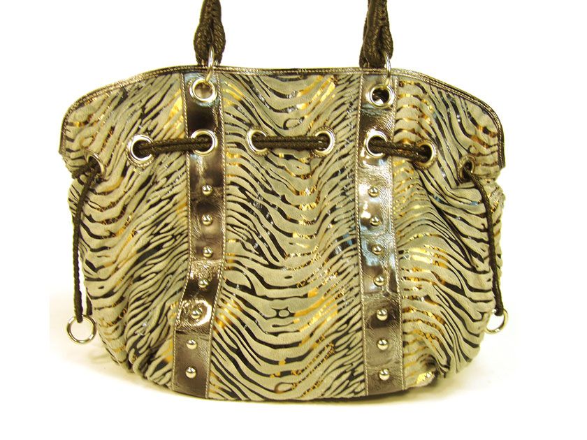 Trendy metallic animal print velvet shoulder bag with drawstring detail. Bag has a zipper closure and a double strap. Made of PU (polyurethane).