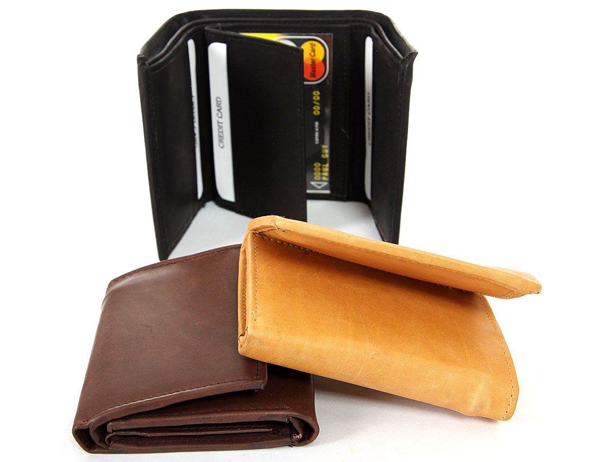 Carry your money in style. This is a genuine leather tri-fold double bill mens wallet. This wallet can hold 8 credit cards and 2 IDs. It is made of genuine cowhide leather. As this is genuine leather, please be aware that there will be some small creases and nicks in the leather but the wallet are all brand new.
