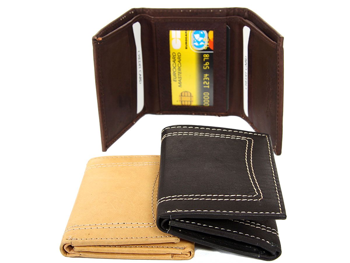 Carry your money in style. This is a genuine leather tri-fold double bill mens wallet. This wallet has 6 credit card slots and 1 ID window. As this is genuine leather, please be aware that there will be some small creases and nicks in the leather but the wallet are all brand new.