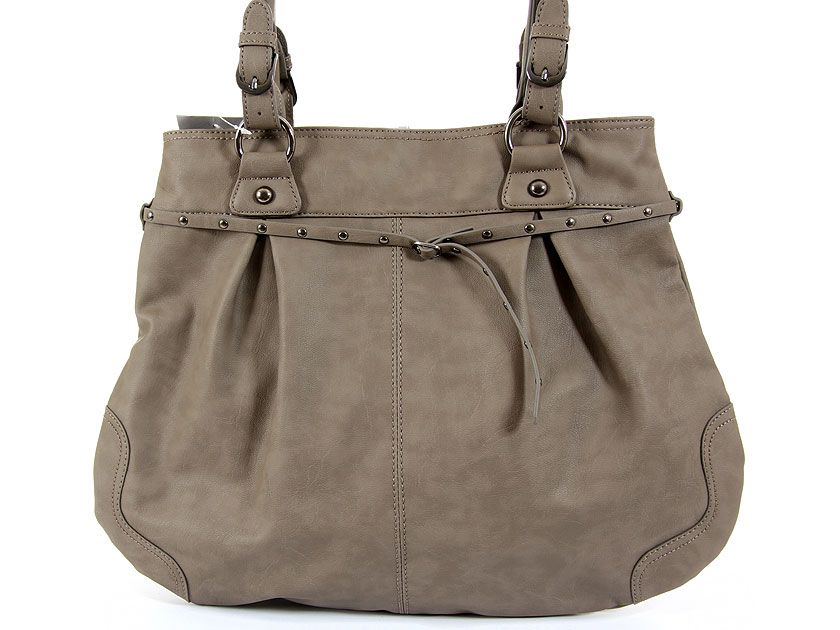 Fashion tote bag has a top zipper closure, a double handle and thin belt detail. Made of faux leather.