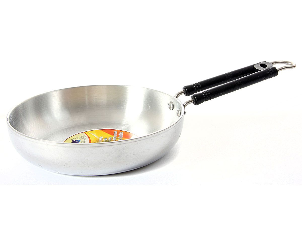 Aluminum Fry Pan with Plastic coated Heavy duty SS Wire Handle. Riveted for long life.