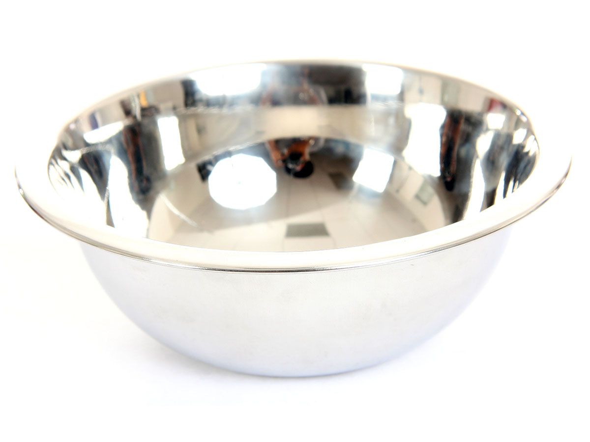 Commercial use deep mixing bowl made of stainless steel, a mirror polish and a rolled edge. Made in India.