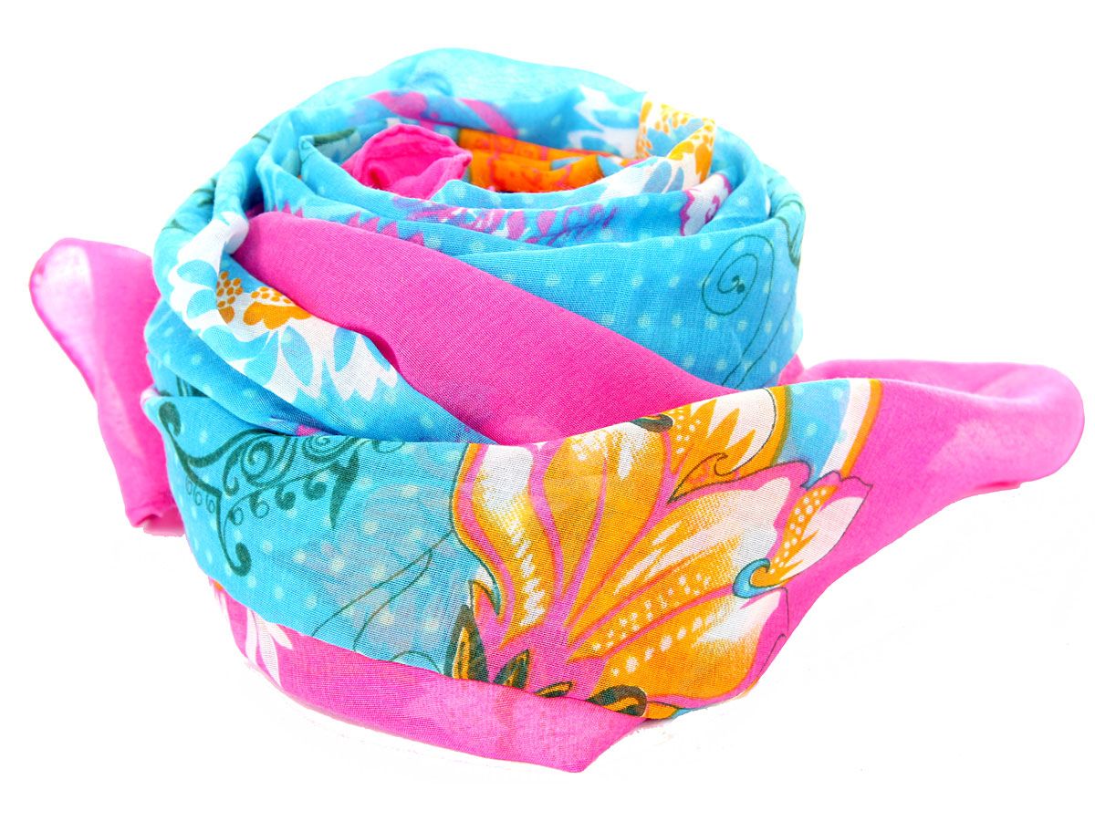 Different kinds of flowers bloom in the middle section of this square scarf in turquoise color with fuchsia border all around. Can be used around the neck or as headgear. 100% Polyester. Imported. Hand wash.