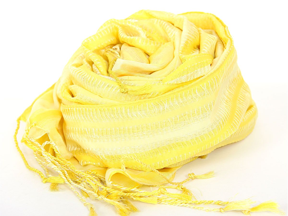 Stripes in shades of yellow spread over this lightweight & long scarf. Stitches like embroidery all along the stripes decorates this little shiny 100% polyester scarf. Long twisted fringes on its ends. Imported. Hand wash.