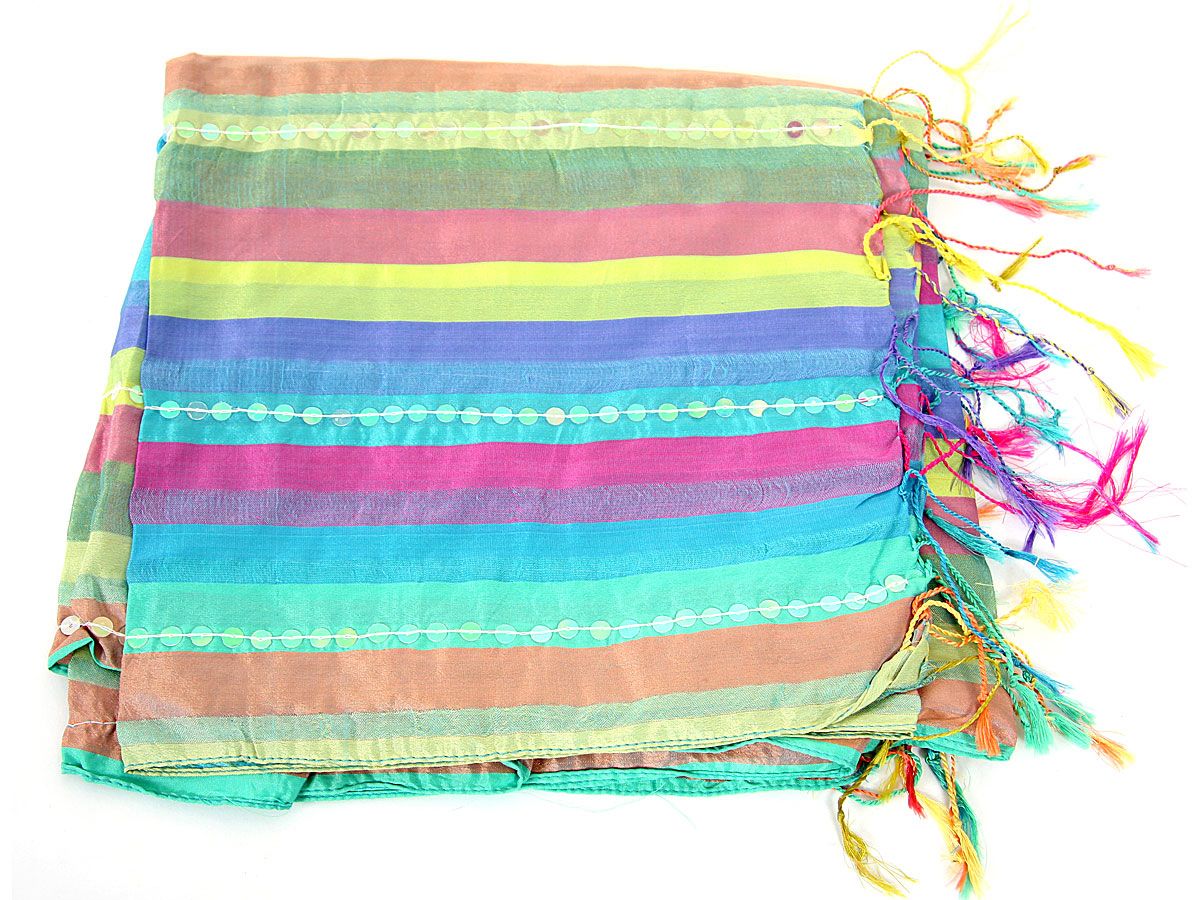 Stripes in multi colors galore over this shiny polyester scarf which also has lines of translucent sequins towards its ends. Thin fringes on its ends completes this 100% polyester scarf. Hand wash. Imported.