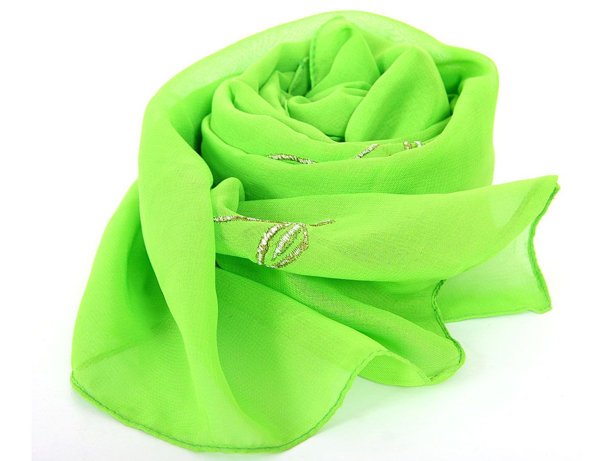 Apple green 100% polyester scarf with sparsely embroidered in shiny thread. Soft & lightweight to use with any kind of outfit. Imported.