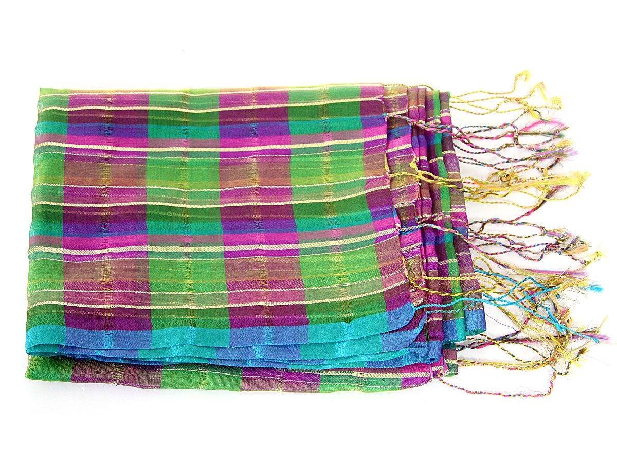 Green & Fuchsia plaids amalgamate over this 100% polyester scarf which has turquoise border along its length. Thin golden stripes run vertically over this sheer scarf. Thin twisted fringes on its edges. Imported.