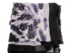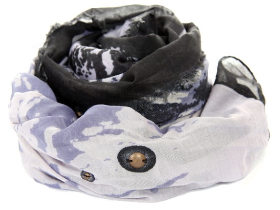 Light purple 100% polyester scarf with black colored abstract print on it. Black border on all sides with little metal studs at some places. Eyelash fringe along bot the lengths of scarf. Imported. Hand wash.