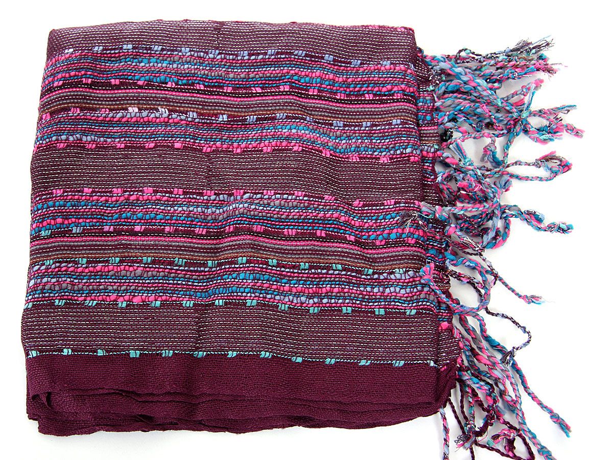 Beautiful burgundy and multi colored design scarf has horizontal open weave pattern. Long twisted fringes completes this 100% viscose scarf. Classy scarf can also be teamed up with a formal dress as a shawl. Imported.