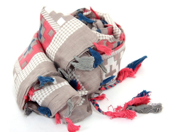 Beautiful geometric Coral and Grey colored pattern scarf. Long tussels completes this scarf.
