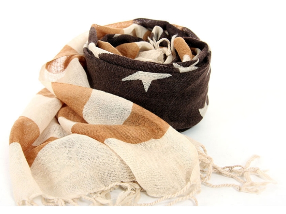 Beige colored wool scarf with mustard horizontal stripes and star print over coffee colored middle of the scarf. Imported. Dry clean only.
