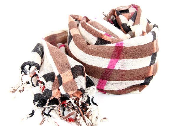 Long twisted fringe decorates the ends of a sumptuous wool scarf updated in an array of colors to match your every mood. Brown, fuchsia & black plaids over beige colored scarf. Imported. Dry clean only.