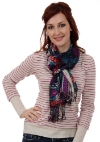 Add a punch of color with this black vivid wool scarf patterned with floral design in blue, red & purple colors and cream colored border along the vertical length. Hanging fringe decorates the ends. 100% woolen scarf. Hand wash. Imported.