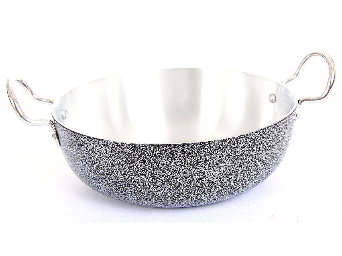 Aluminum Wok Pan coated on outside and Riveted Stainless Steel Handles for Long Life.