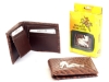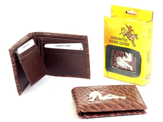 Embossed outer shell genuine leather bi-fold men wallet with solid zinc metal fitting.