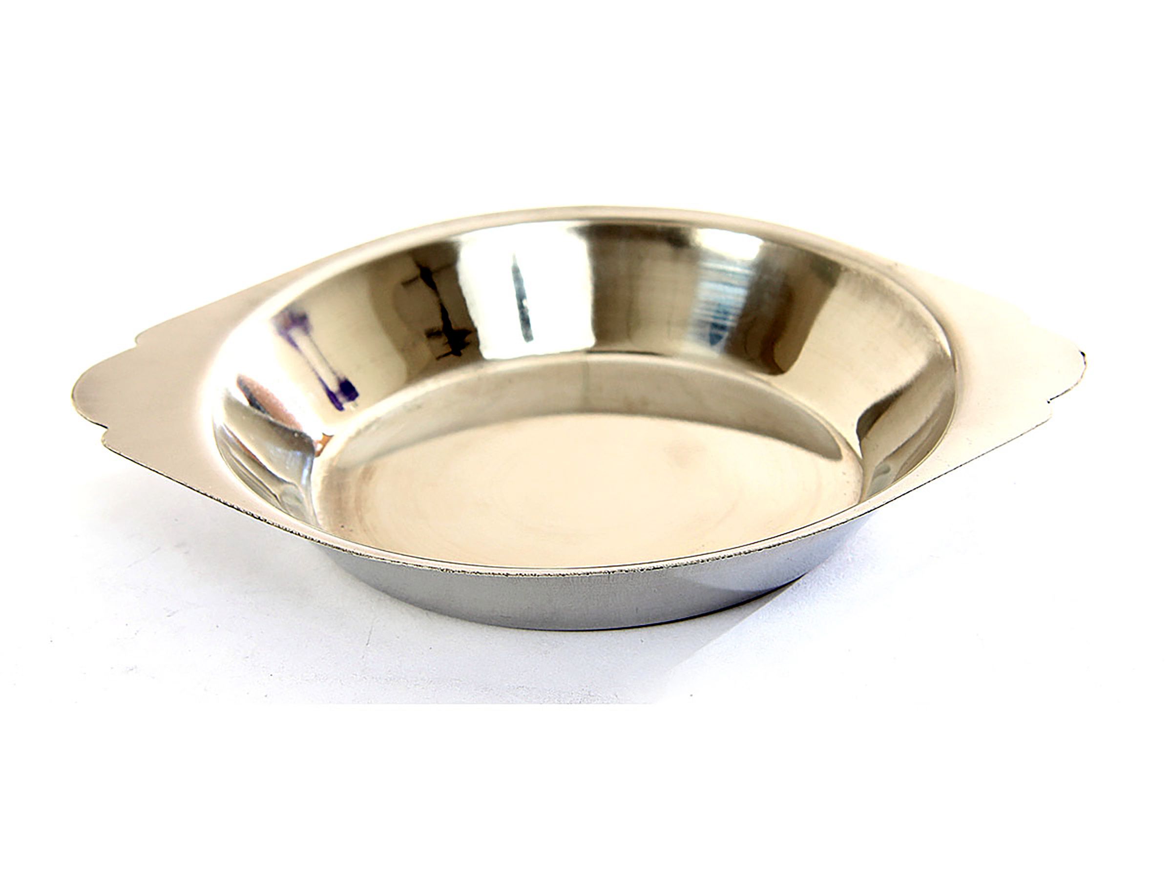 Stainless round gratin dishes make table service of hot food easy! The 8 ounce size makes them especially good for bubbling appetizers and heated desserts. Stainless round gratin dishes have side handles for comfortable transport. They are stack-able to maximize valued storage area. Stainless round gratin dishes have a bright finish that enhances any food presentation.
