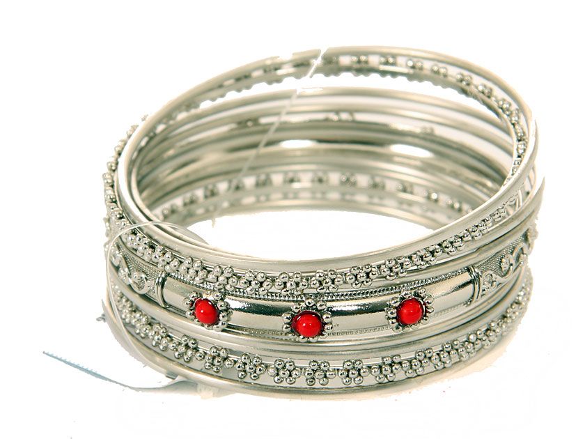 Metal Bangles Size:2/10, (9 PCS Set), Silver/Mat.Silver, Opak Kundan Work