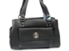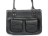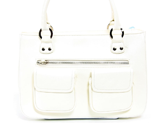 Front Double Pocket Fashion handbag has a top zipper closure and a double handle. Made of faux leather.