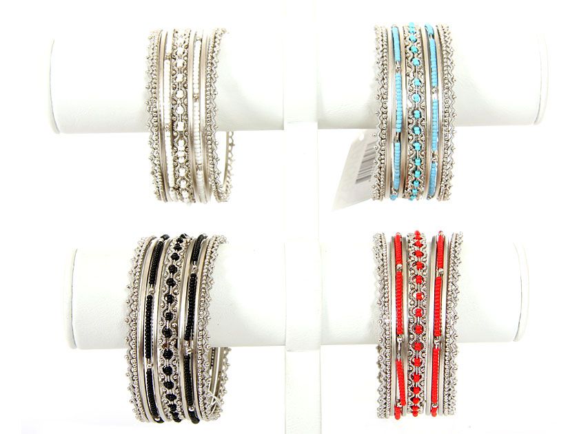 Metal Bangles Size:2/10,(7 Pcs Set), Silver Plating, Opak Glass Beads, (12 Sets In Box) Colors: Black, Coral Red, Opak Turquoise #B-4820