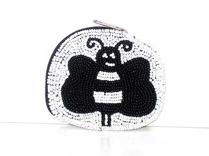 Beaded oval coin purse with bee shape pattern on it. Top zipper closure with wrist strap. Imported.
