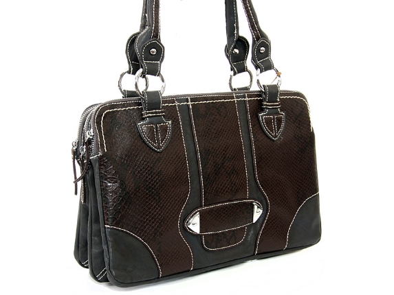 Fashion handbag has a double hanlde, top zipper closure, separate compartments, and a two tone design. Made of PU (polyurethane).