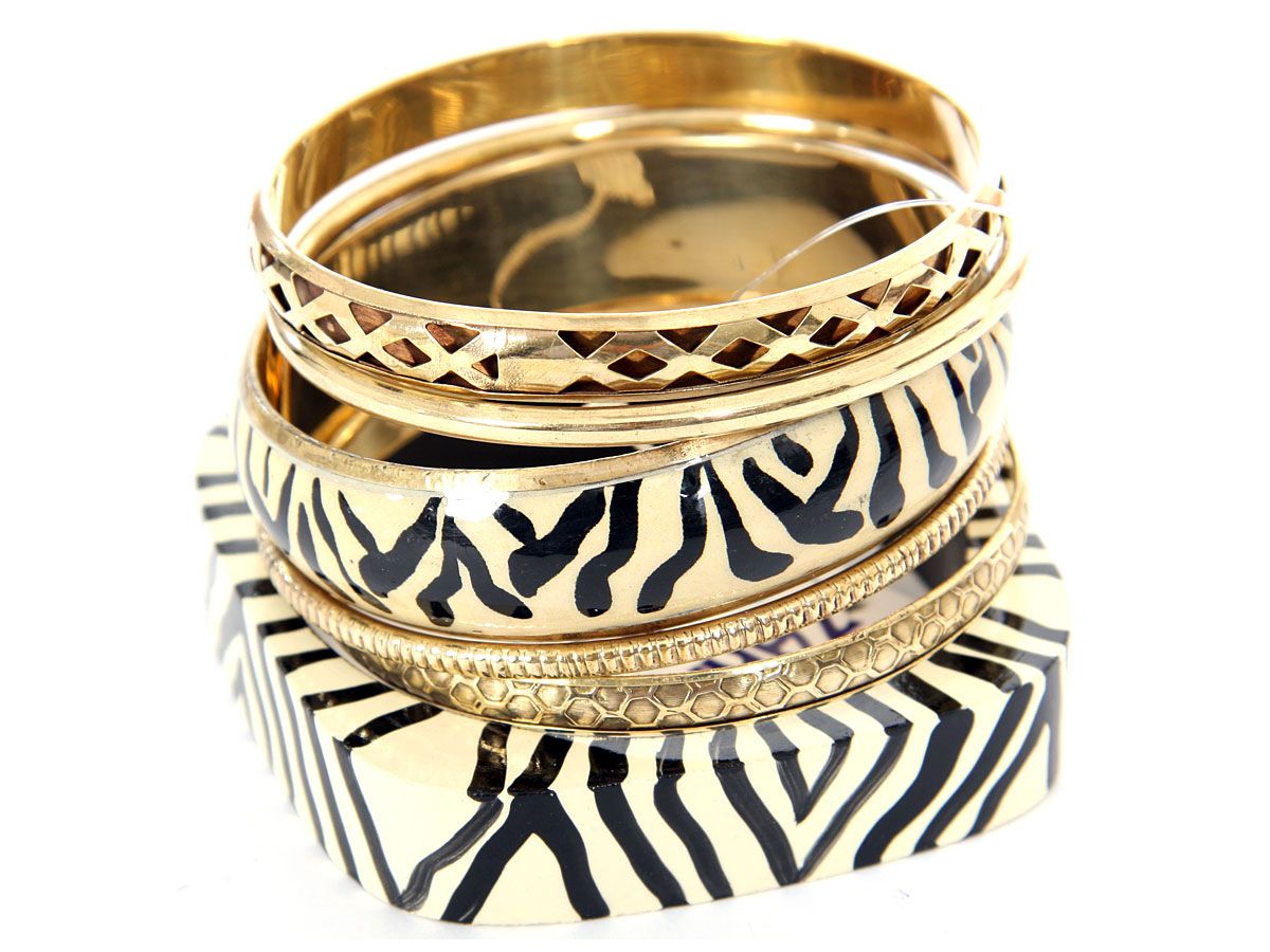 Tribal inspired design ivory wooden & metal bangle with black painted lines. 4 gold tone bangles with each having its own etched design or is plain & simple. Funky looking set can give an edge to any kind of outfit.