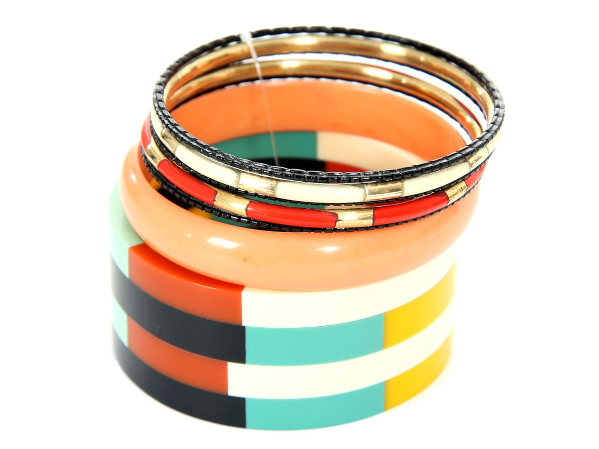 Artistically designed colorful set can be matched with number of outfits any time of the day. 7 piece bangles set includes one wide cuff colorful bracelet, one peach rounded bangle, 3 thin black bangles & two ivory/gold resin bangles.