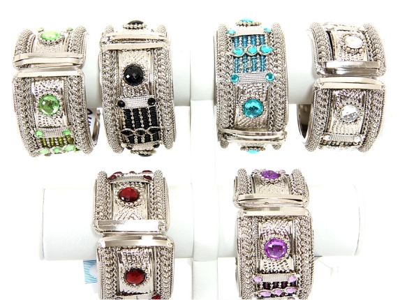 Folding Metal Bracelet Size: 1.5" Broad, Silver Plating, Glass Beads/Tr. Kundan Color" Black, Maroon, Turquoise, Crystal, P.Green, Purple(2 PCS Each),,(12 PCS in Box)