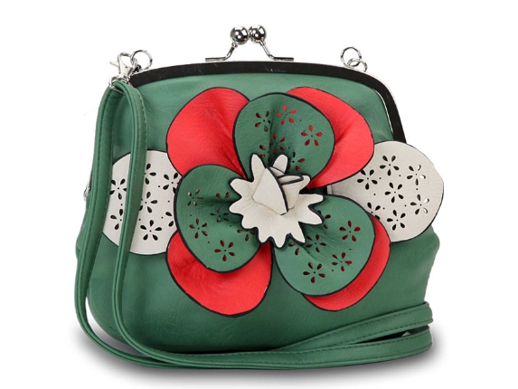 Faux leather clutch bag has a kiss lock closure, a detachable single strap and a colorful accentuating floral detail.
