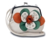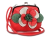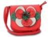 Faux leather crossbody small bag has a large floral detail with contrasting colors. Bag has an adjustable strap, top zipper closuer and front flap closure. Made of faux leather.